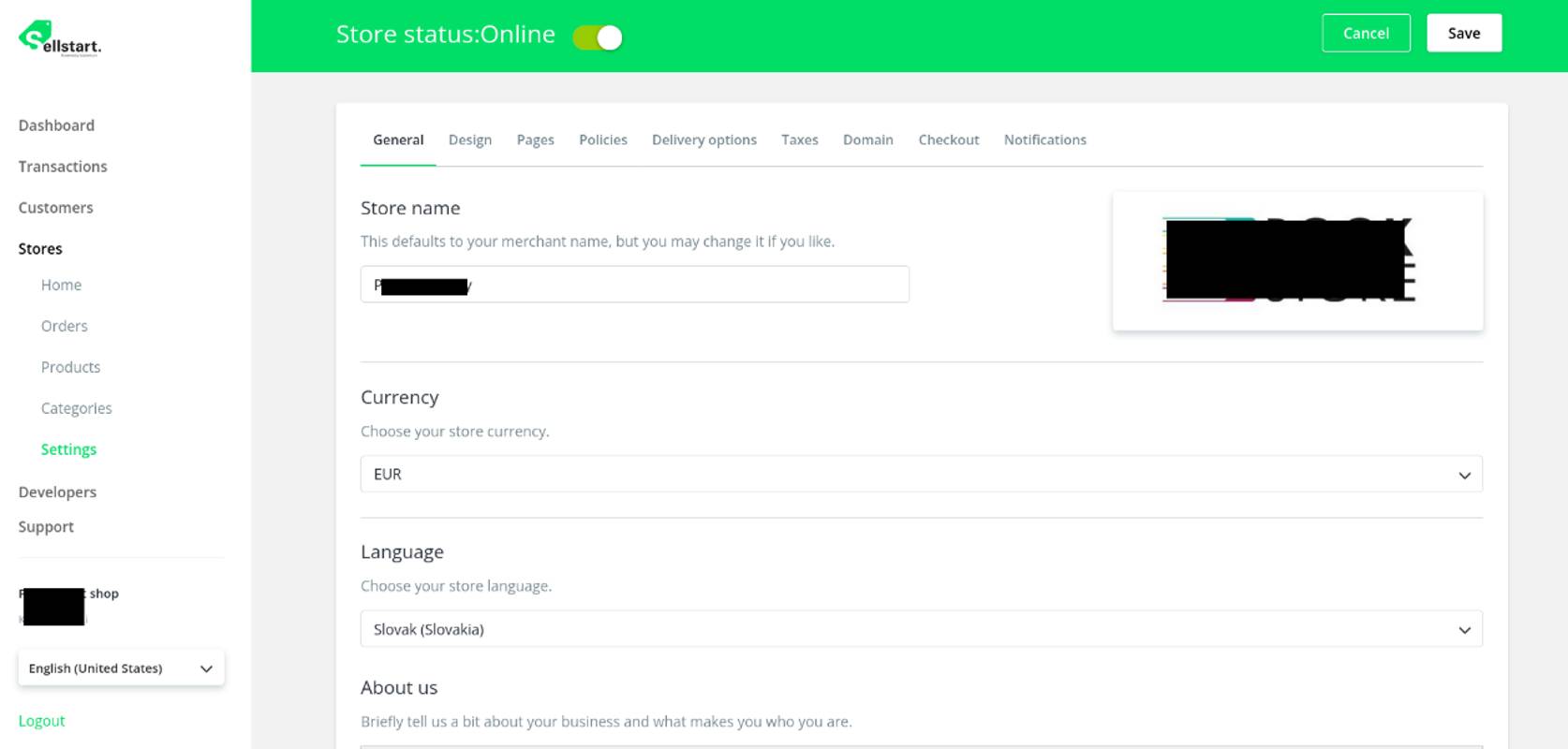 In the "General" tab, you can provide essential information about your store, such as its name, currency, language, about us description, business contact details, support contact information, and social media accounts. Fill in the required fields and click "Save" when you're done.