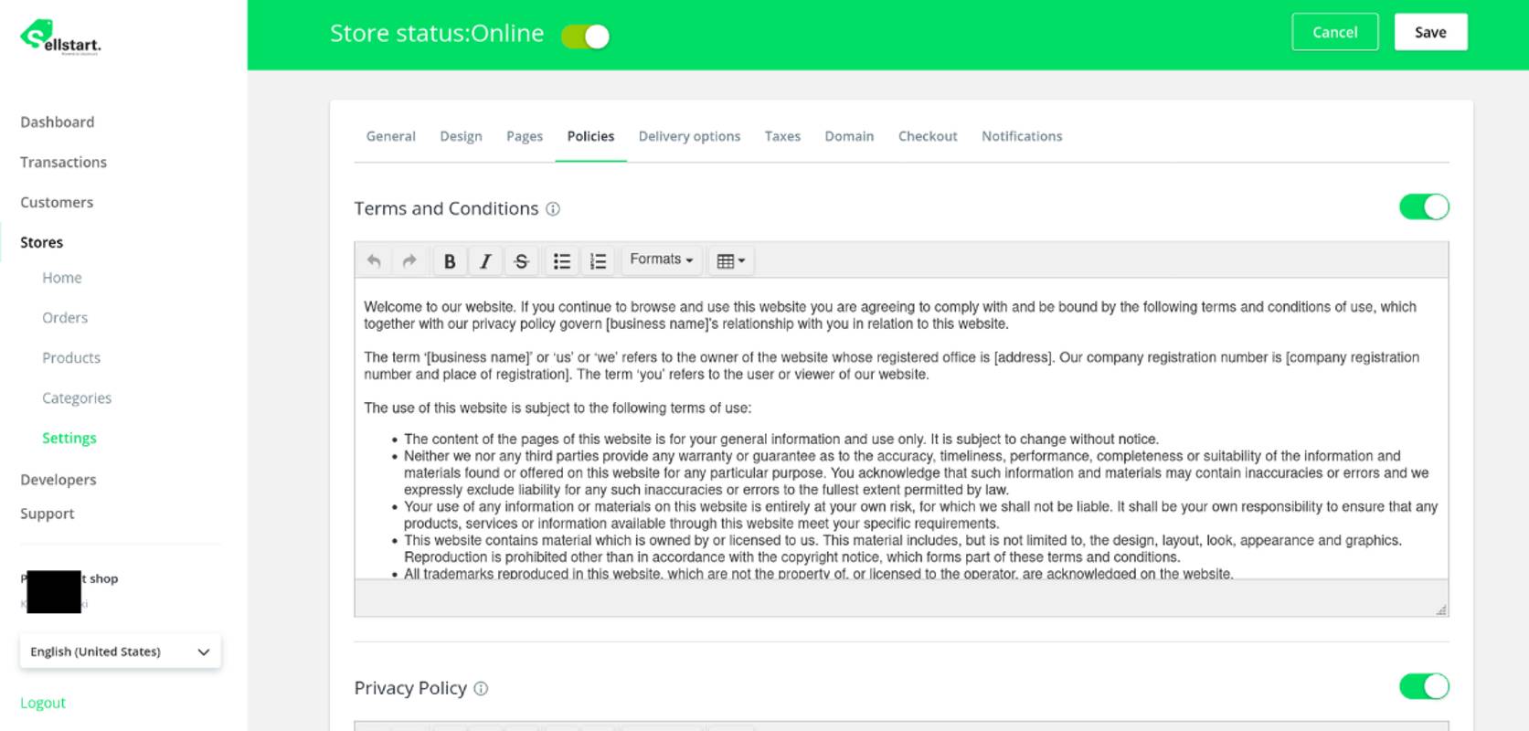 Finally, in the "Policies" tab, you can create or edit your store's privacy policy, terms of service, and return policy.